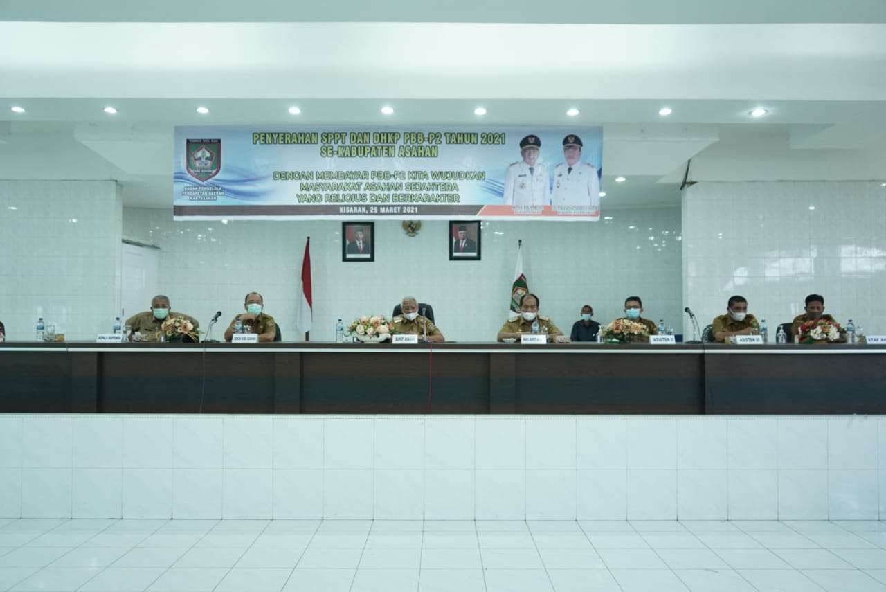 Bupati Asahan H. Surya, BSc menyerahkan Surat Pemberitahuan Pajak Terhutang (SPPT) dan Daftar Himpunan Ketetapan Pajak dan Pembayaran (DHKP) Pajak Bumi dan Bangunan Sektor Perdesaan dan Perkotaan (PBB-P2) tahun 2021 kepada Camat se-Kabupaten Asahan di Aula Melati Kantor Bupati Asahan, Senin (29/03/2021).